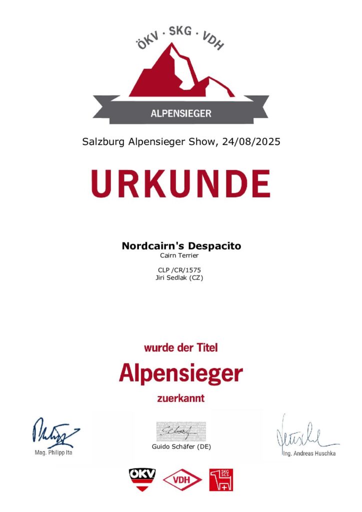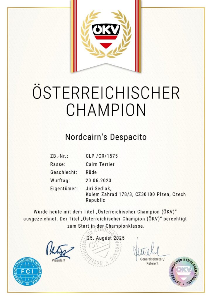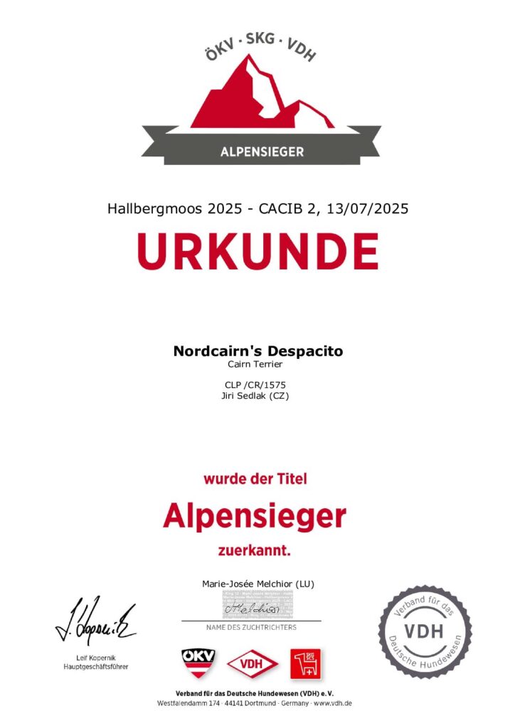C.I.B.-J, GCH-CZ, CH-CZ, CH-DE(Anw.Dt.Ch.VDH), CH-A, CH-PL, JCH-CZ, JCH-KCHT, CH-KCHT